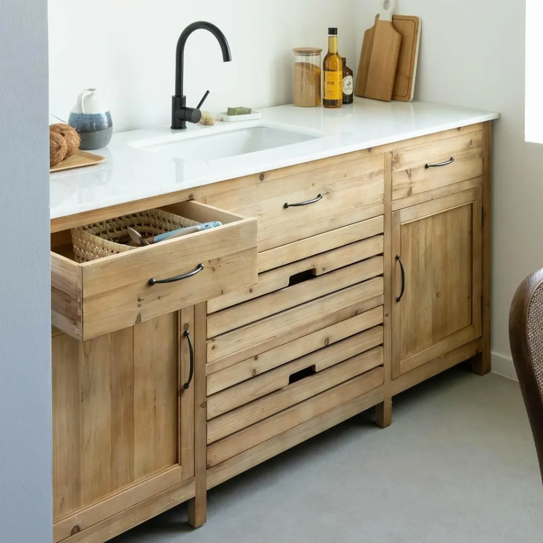 La structure en bois de pin recyclé met en valeur les irrégularités propres au matériau, pour un rendu authentique et plein de charme. Les façades alternent lames ajourées et panneaux pleins, soulignées par des poignées noires en métal vieilli, dans un esprit maison de campagne revisité.