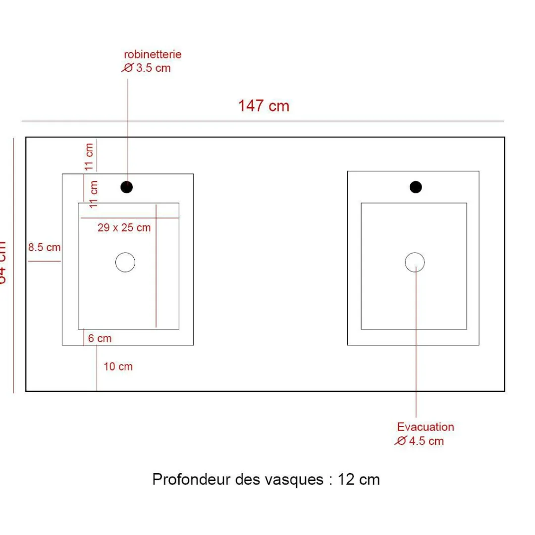 Trou robinetterie diam 3.5 cm – trop plein – trou pour la bonde diam 4.5 cm – Etagère amovible – Bloc tiroir en plastique – Vasques encastrées dans la pierre . Le diamètre du trou prévu pour le robinet est de 3,5 cm.