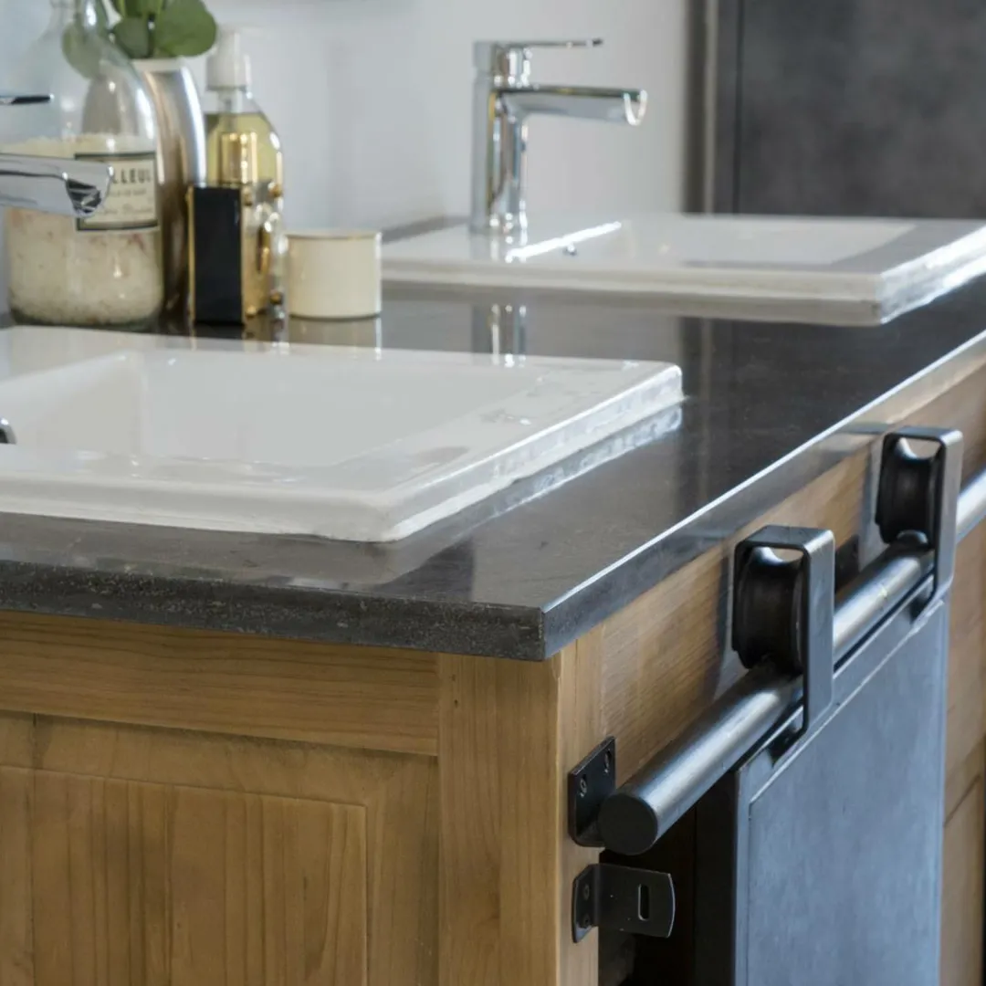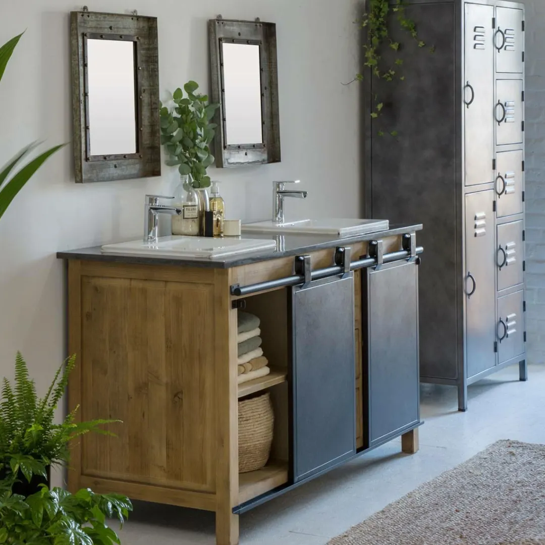 Idéal pour une famille nombreuse, ce meuble double vasque saura accueillir les effets personnels de chaque membre de votre famille ! Son large plateau en pierre bleue de 1m45 et ses divers rangements faciliteront votre quotidien. Ce meuble salle de bain bois massif est à la fois pratique et élégant. Il saura apporter à votre salle de bain un certain charme grâce à l’alliance du pin recyclé et de la pierre bleue mais aussi une jolie touche de modernité grâce à ses portes coulissantes et roulettes en métal noir. Jouez la carte de l’originalité en le choisissant.