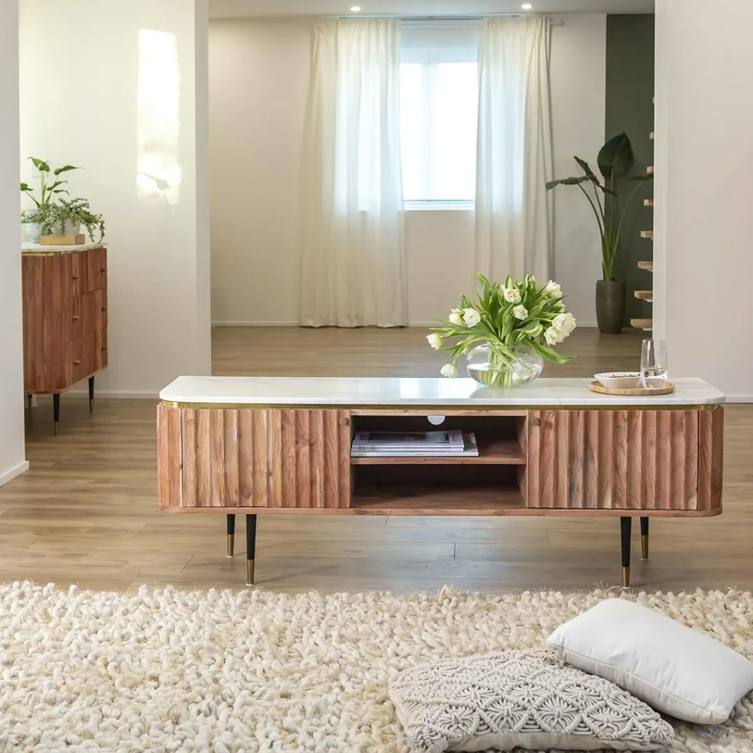 Passons aux présentations. Ce meuble tv bois massif répond parfaitement à la tendance actuelle grâce à son design arrondi. Ce design se répand à une vitesse folle dans nos intérieurs… Côté rangement, il vous propose 2 portes qui vous aideront à cacher vos magazines, ordinateurs, paperasses, et autres objets du quotidien ainsi que 2 niches placées au centre.