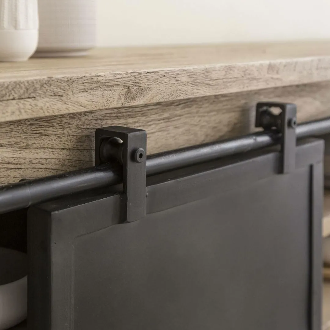 Ce meuble TV industriel sera votre allié pour décorer et stocker. Son réel plus est l’originalité de ses portes coulissantes. Elles apportent autant au design du meuble qu’à sa praticité. Il combine différents moyens de stockage afin de faciliter votre rangement. Les 6 niches mises à disposition vous permettront de ranger et trier vos objets de façon organisée. Les portes coulissent facilement à l’aide de deux rails en métal gris foncé.