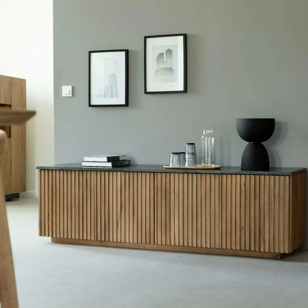Apportez du cachet à votre salon avec ce meuble TV en bois de manguier et marbre noir de la collection Betty. Son format généreux et ses finitions soignées en font une pièce forte, à la fois élégante et fonctionnelle. Le bois de manguier, clair et chaleureux, contraste avec le plateau en marbre noir veiné qui apporte une note luxueuse à l’ensemble. Les portes centrales rainurées signent une silhouette graphique et contemporaine.