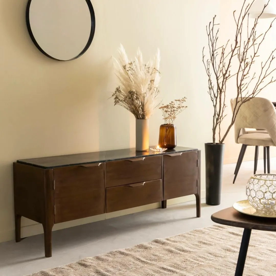 Ajoutez une touche d’élégance à votre salon avec le meuble TV Roch. Son mix parfait entre le bois de manguier chaleureux foncé et le marbre noir chic, alliant style contemporain et vintage, fait toute la différence.