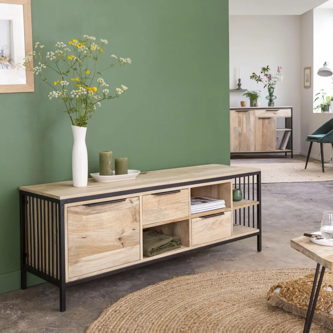 L’atout principal de ce meuble TV industriel est qu’il est constitué de bois de manguier, un matériau réputé pour sa robustesse. Les nuances de ce bois amènent une belle touche chaleureuse à l’ensemble du meuble ainsi qu’à votre intérieur. Le piètement a été conçu en métal afin d’accentuer la solidité globale du meuble. Le mélange entre le bois clair et le métal foncé apporte un bel équilibre au meuble. Grâce à ses atouts, il deviendra très certainement la pièce maîtresse de votre salon et attirera l’attention de vos convives au premier coup d’œil.