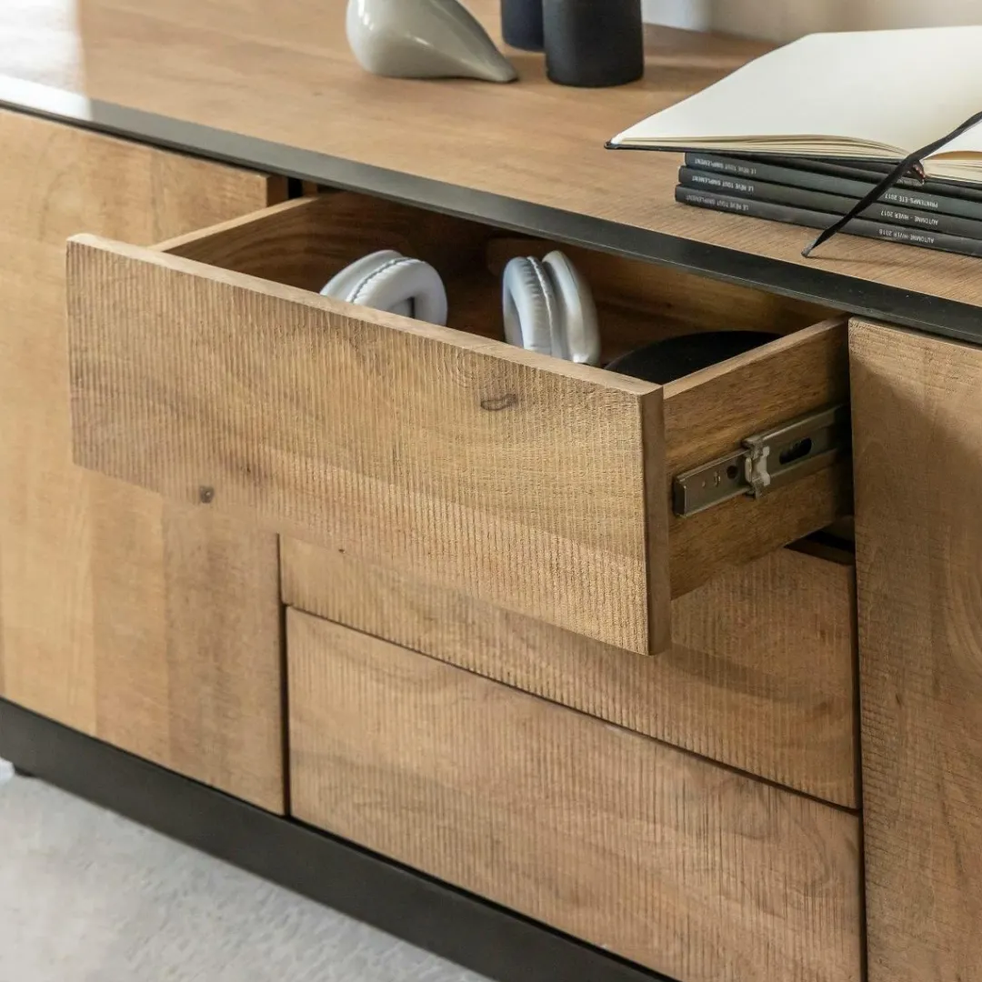 Ce meuble TV est aussi pratique que stylé : il dispose de deux portes latérales dissimulant de grands compartiments pour vos équipements multimédias, vos livres ou vos objets du quotidien. Trois tiroirs centraux vous offrent un espace de rangement supplémentaire, idéal pour les télécommandes, les câbles ou les accessoires. Sa structure en métal assure stabilité et longévité, pour un meuble aussi esthétique que durable.