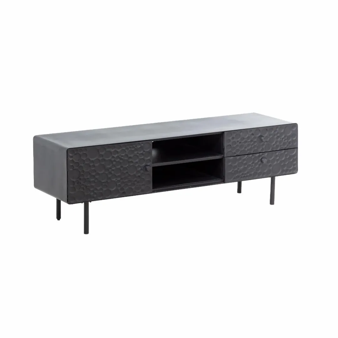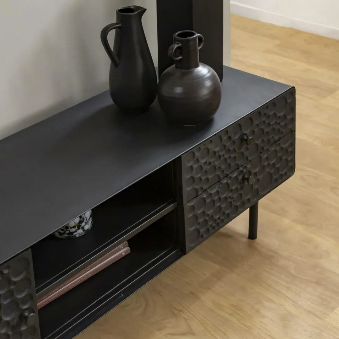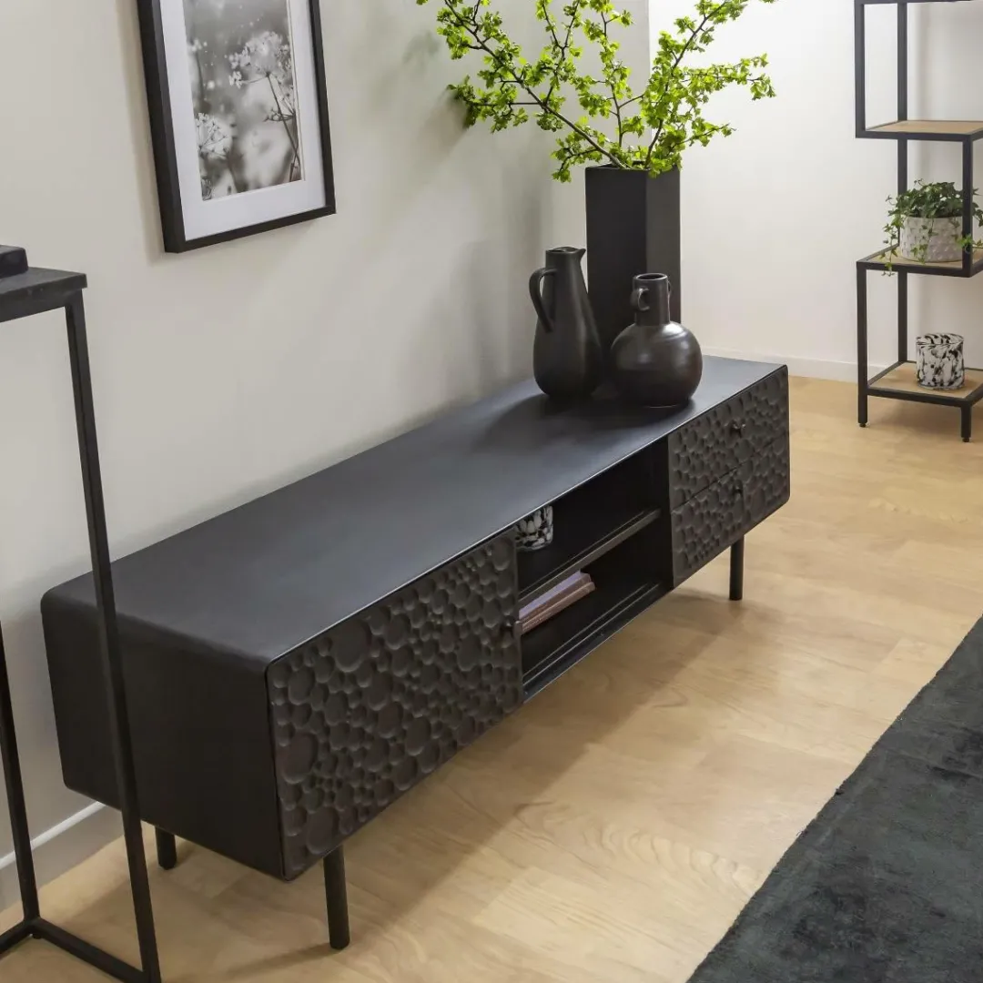 Ce magnifique meuble est fabriqué en bois de manguier robuste, associé à des cadres en acier modernes qui ont été finis dans un noir saisissant. Ainsi, vous obtenez non seulement un meuble esthétique, mais aussi un meuble qui offre des options de rangement fiables et pratiques. Il possède des tiroirs spacieux, idéal pour les objets indispensables que l’on veut avoir à portée de main. La surface supérieure offre suffisamment d’espace pour accueillir des téléviseurs jusqu’à 70 pouces, ainsi que d’autres appareils numériques.