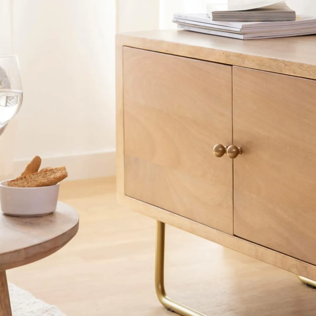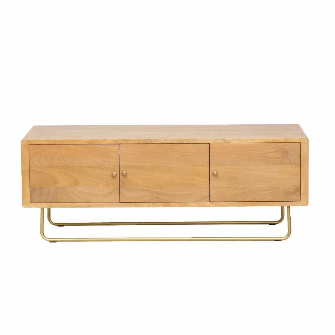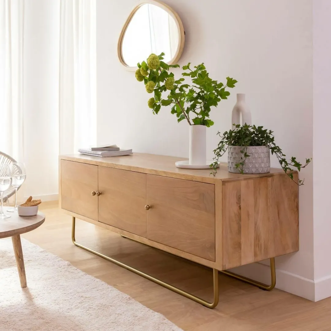Voici le meuble TV Zack, conçu avec style et sophistication à l’esprit ! Ce meuble époustouflant est fabriqué en bois de manguier et comporte deux pieds en métal doré, créant ainsi une ambiance contemporaine et minimaliste qui fera certainement l’envie de toute la famille et de tous les amis. Zack est le complément idéal de tout espace de vie et ne vous décevra pas.