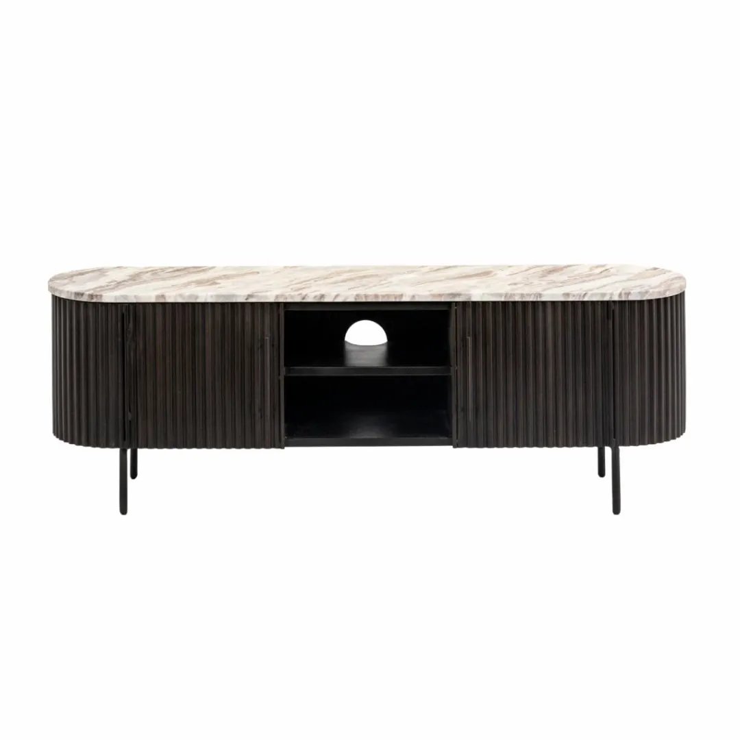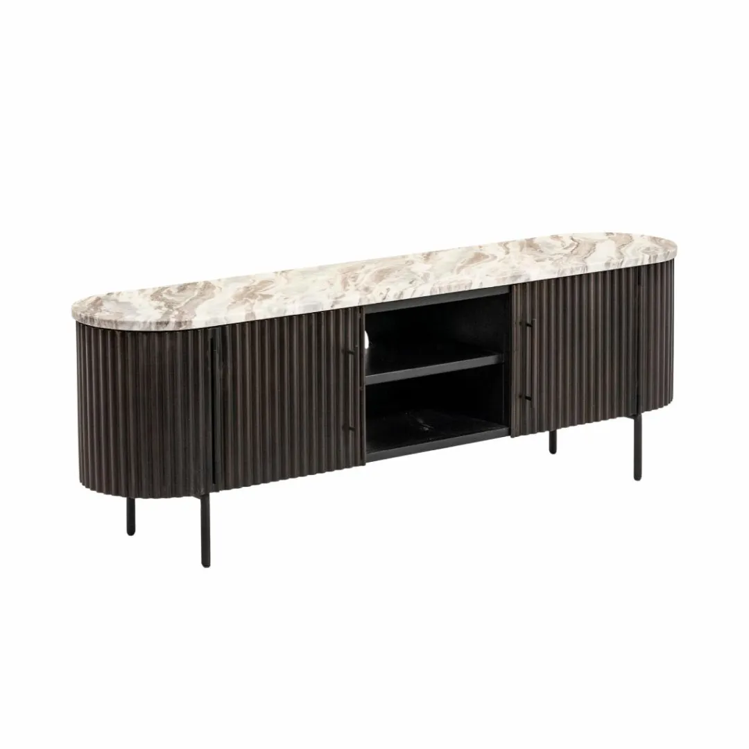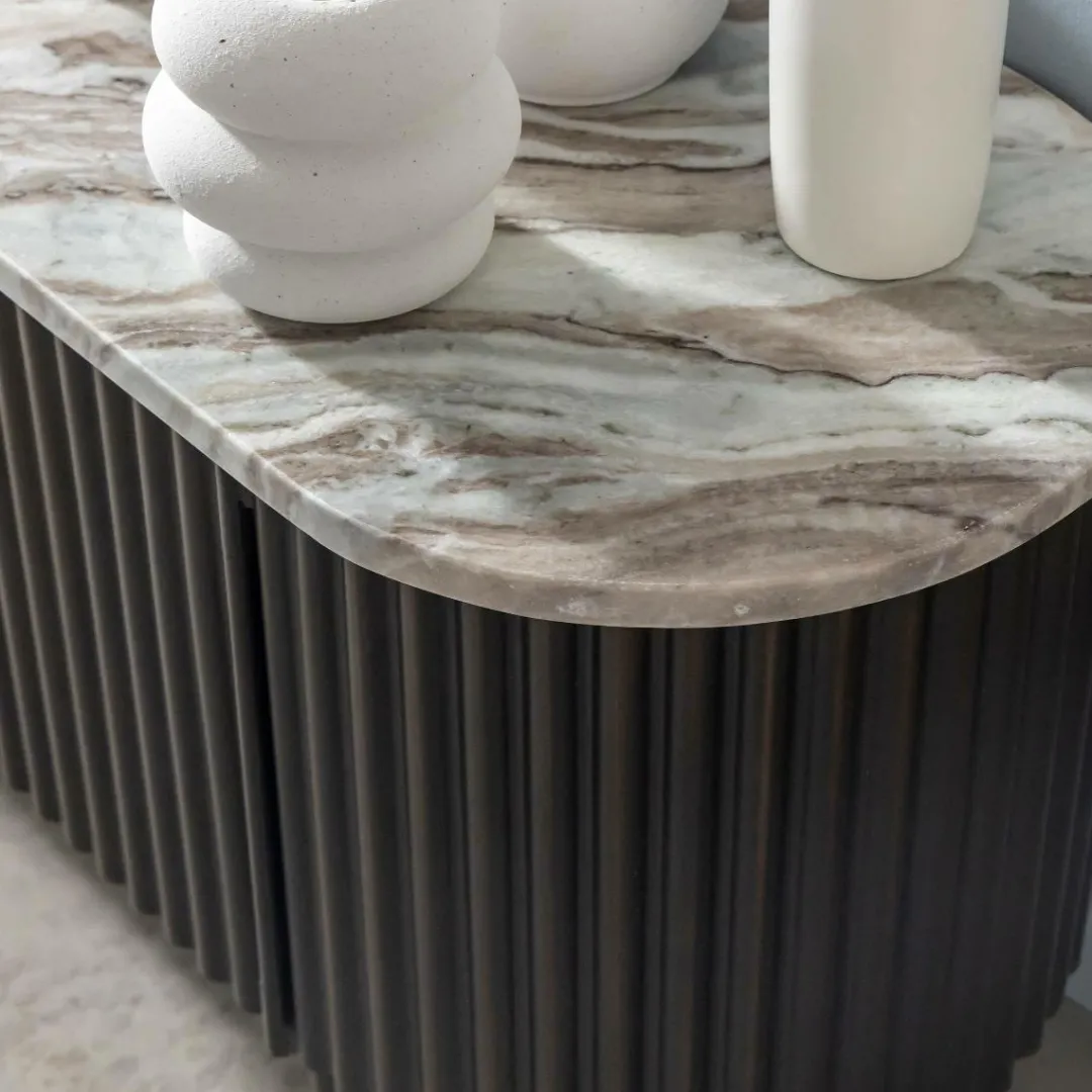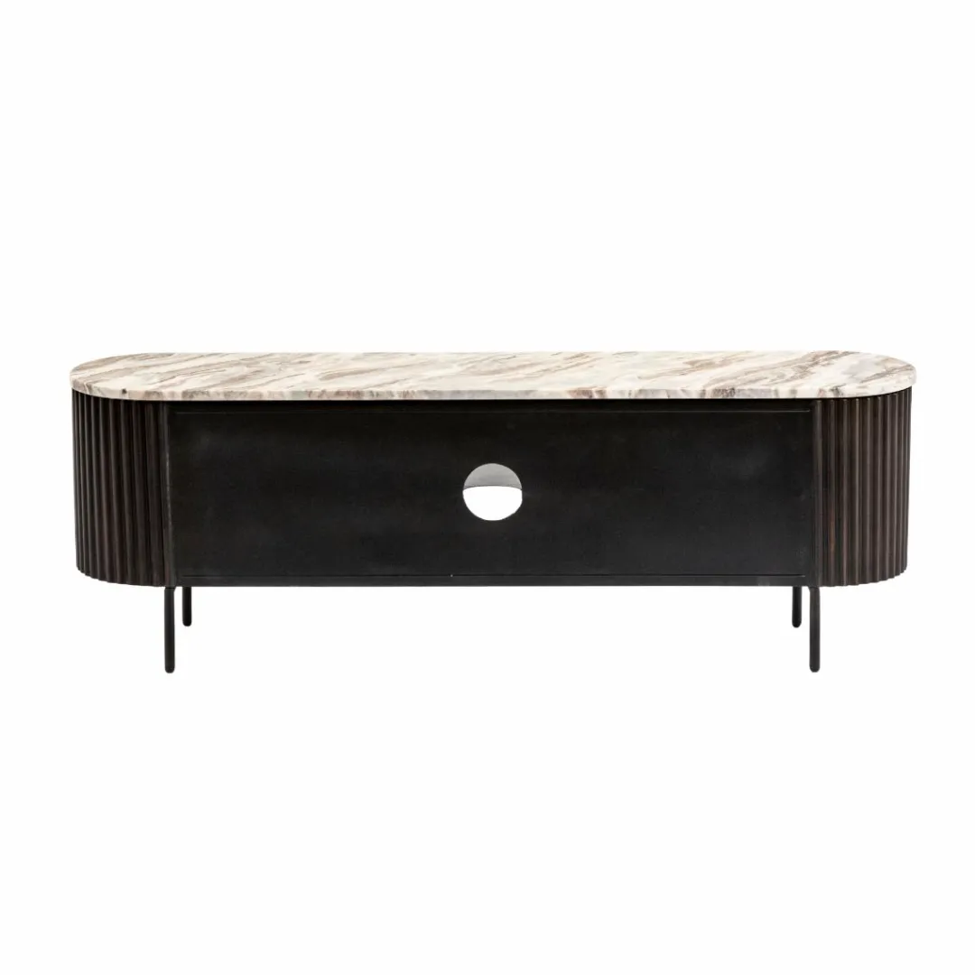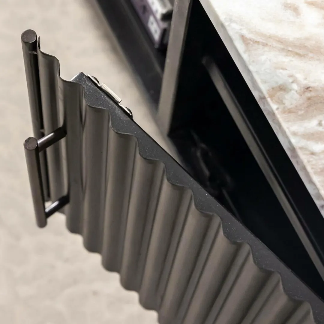 Découvrez le meuble TV Alfred, une pièce pensée pour apporter du caractère à votre espace de vie. Réalisé en métal avec de subtils reflets bronze, il présente un jeu de matières élégant qui lui confère une allure très actuelle. Son plateau en marbre apporte une touche minérale unique, avec des veinures naturelles qui font de chaque meuble une pièce singulière.