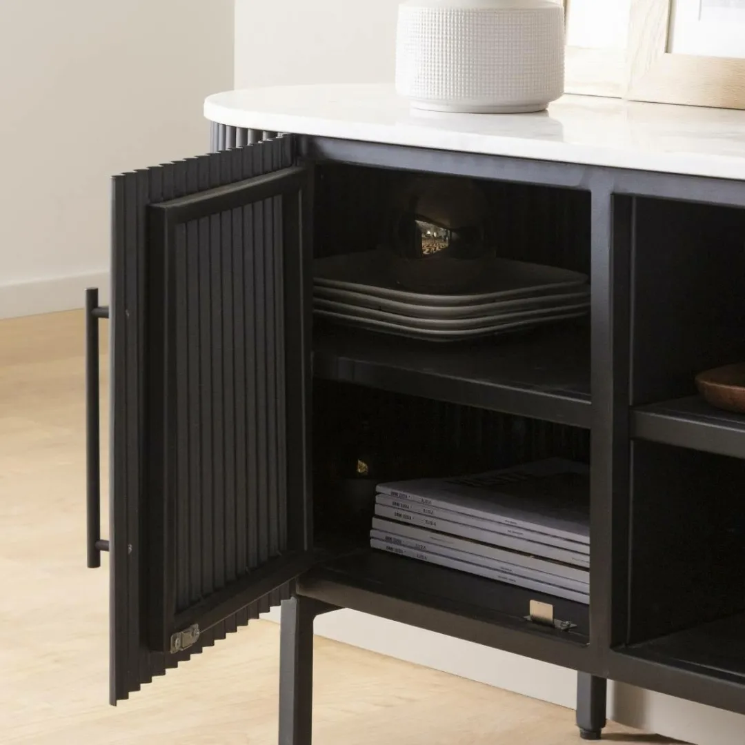 Les deux compartiments ouverts au centre vous permettent d’exposer vos objets de décoration préférés, tandis que les deux compartiments fermés de chaque côté vous offrent un espace de rangement pratique pour dissimuler les câbles et autres accessoires.