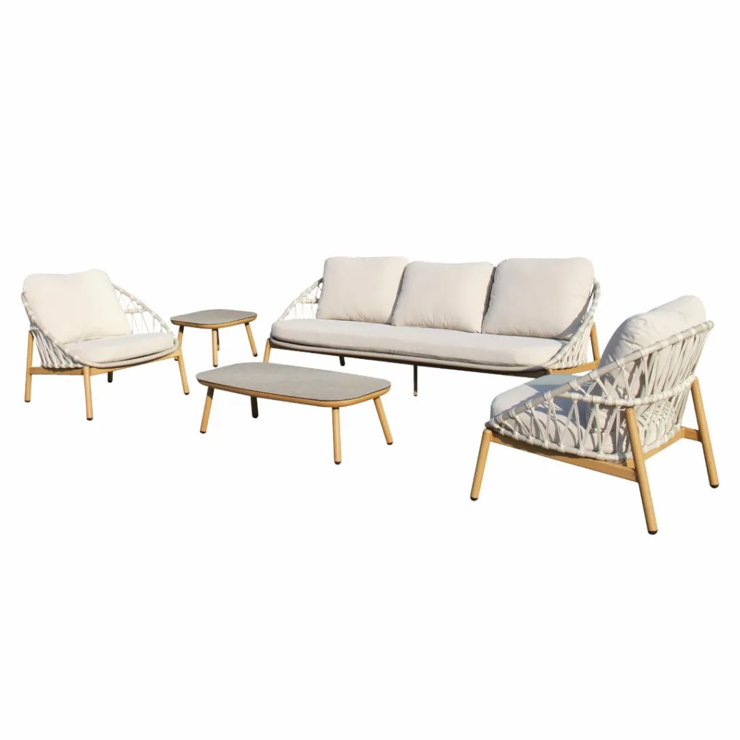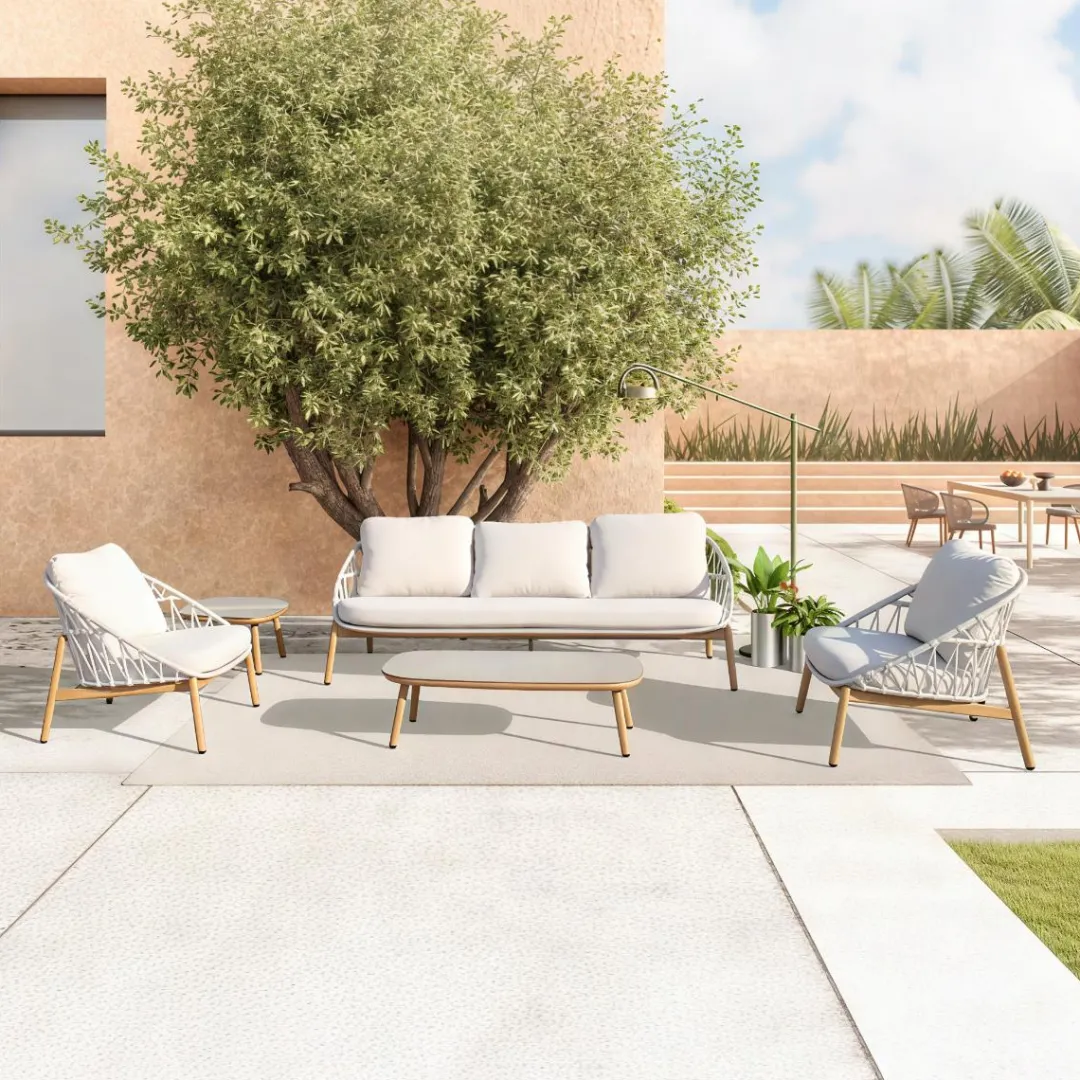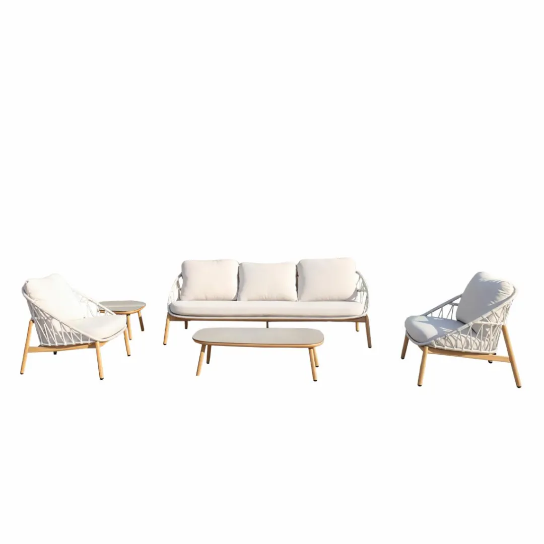 Leur dossier en corde blanche apporte une touche bohème, tandis que la structure en aluminium effet bois assure solidité et légèreté.Les coussins moelleux offrent un confort optimal pour des moments de détente en plein air. Parfait pour sublimer votre terrasse ou jardin avec style et modernité.