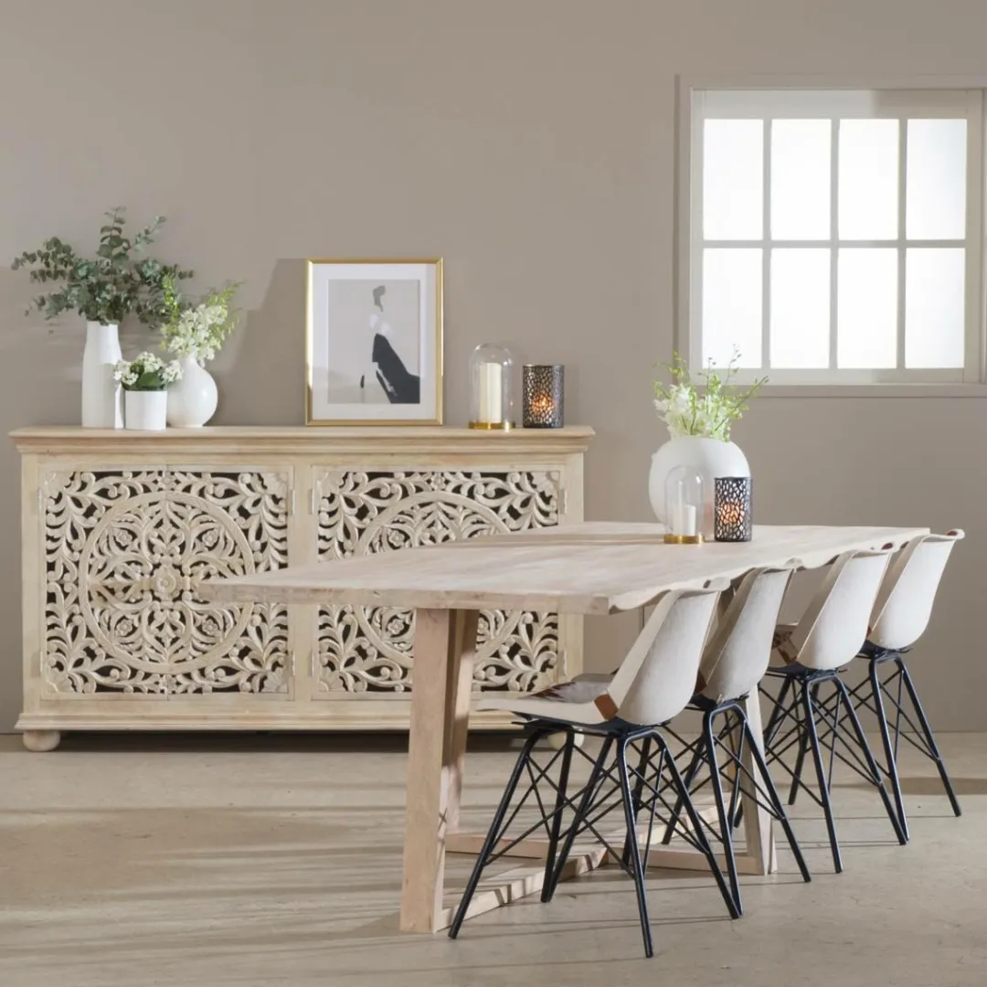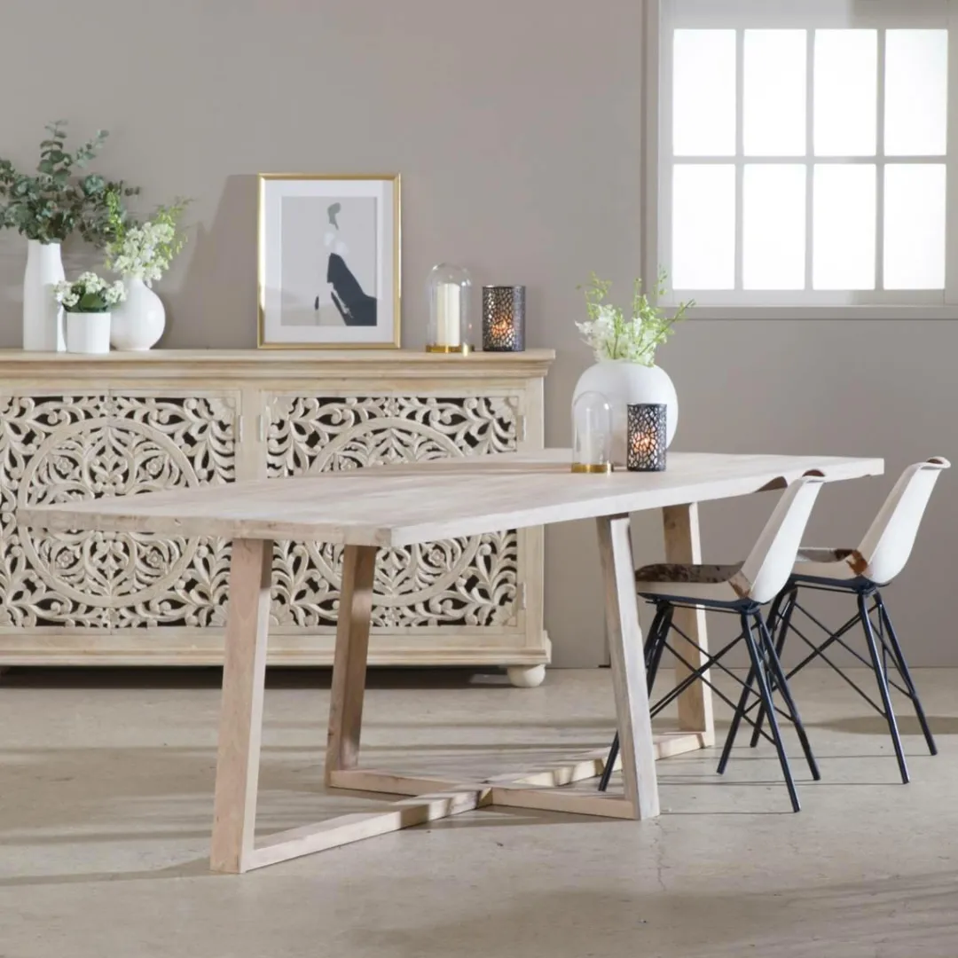 Conçue à partir du bois de manguier, on aime ce bois exotique qui diffuse des nuances lumineuses. Son plateau, réalisé entièrement en bois massif vous apportera stabilité et robustesse au quotidien. Elle vous permettra de rassembler au moins 10 personnes.
