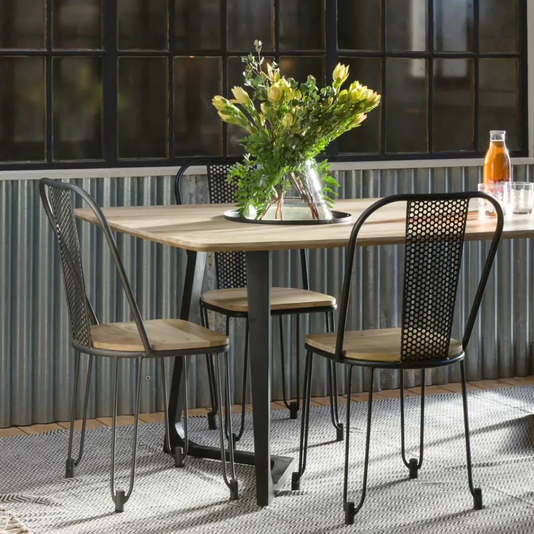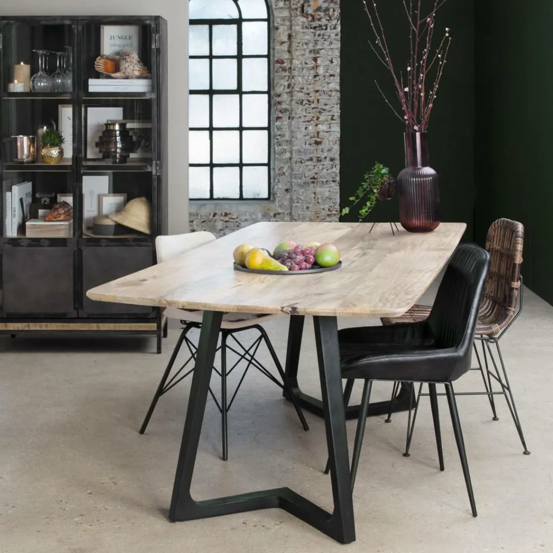 On n’hésite pas à l’accompagner de chaises en velours pour un rendu tendance, ou encore de chaise en cuir pour un effet 100% industriel ! N’hésitez pas à adopter un banc pour renforcer le côté convivial de cette table. Le bois de manguier est un bois qui s’entretient très facilement.