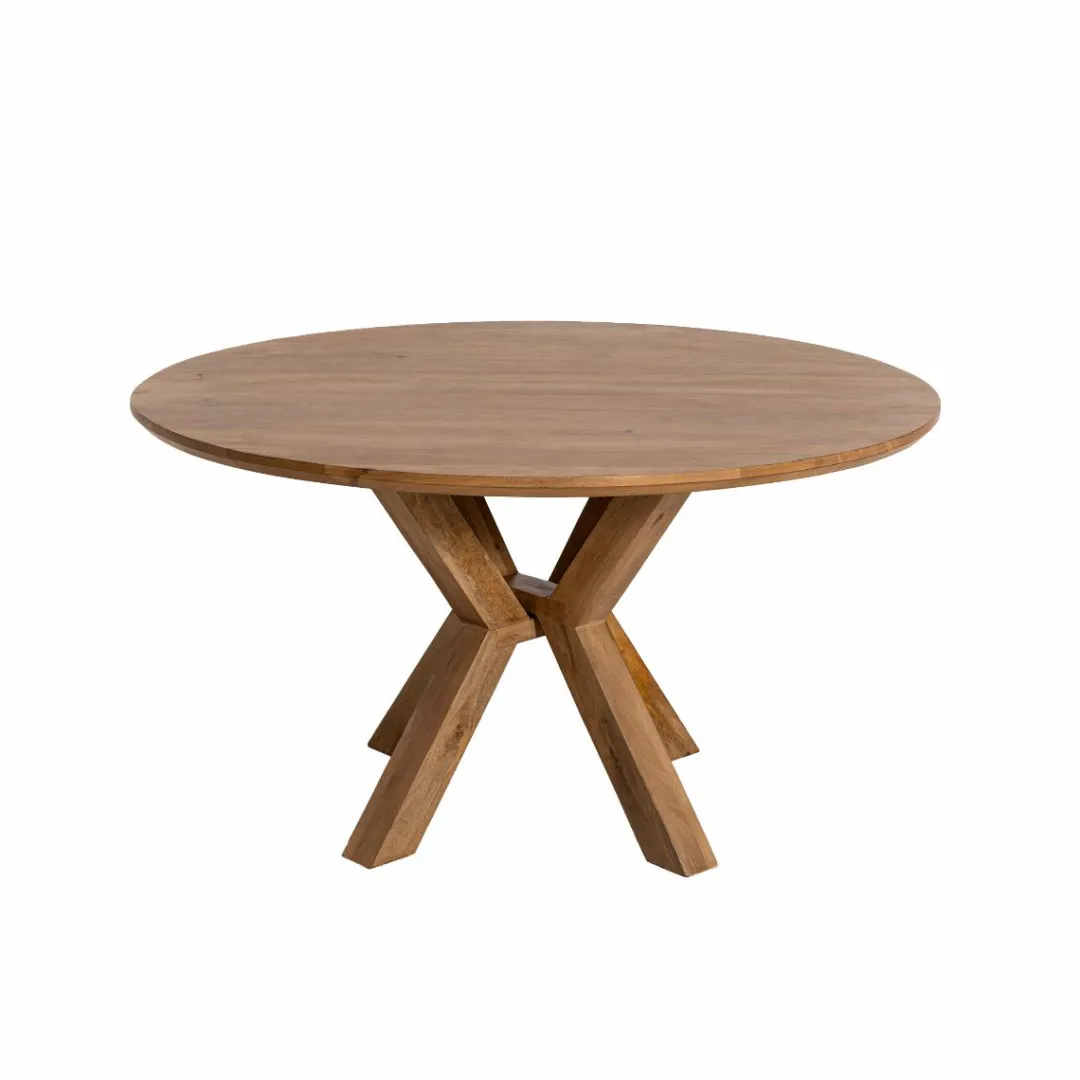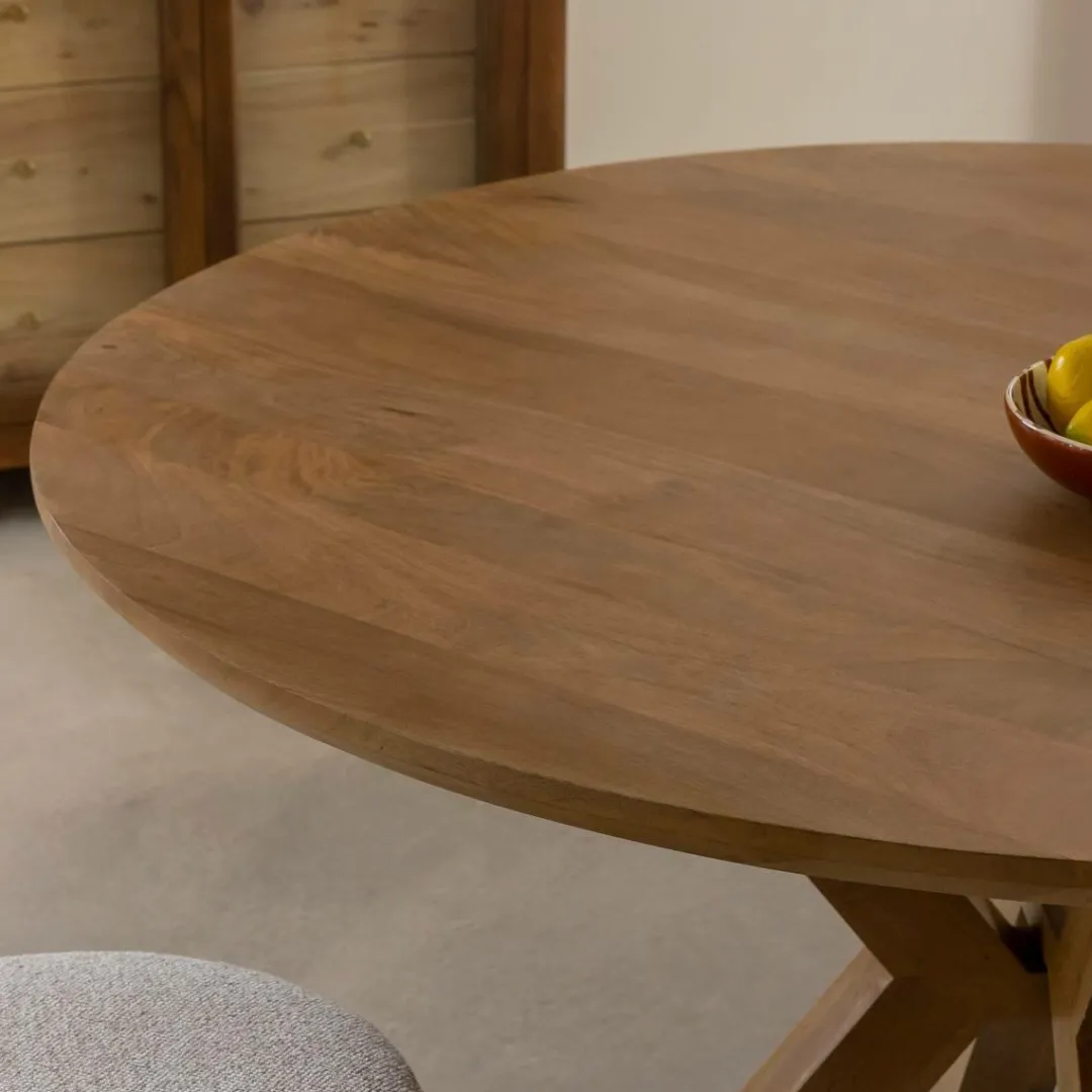 Créez un espace de convivialité avec cette table ronde en bois de manguier de notre collection Maloé, au design sculptural et chaleureux. Son plateau circulaire repose sur un piètement central croisé, à la fois original et stable, qui évoque les inspirations géométriques du mobilier contemporain. Le bois de manguier dévoile un veinage doux et irrégulier, typique des essences exotiques, pour une ambiance naturelle et authentique.