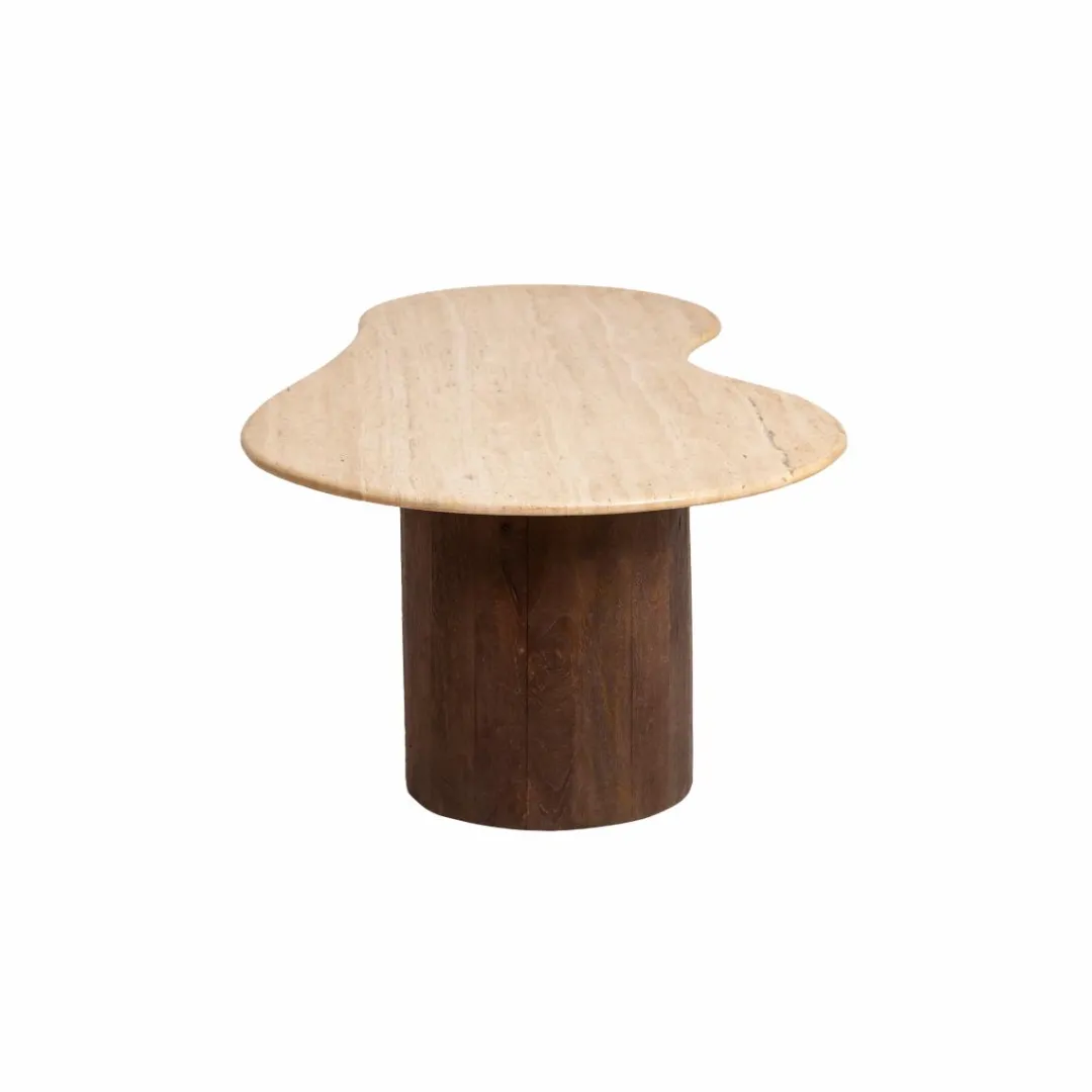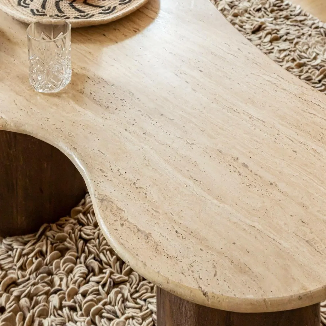 La table présente un magnifique plateau en travertin soutenu par des pieds en bois de manguier luxueusement travaillés. Ce design élégant et sophistiqué ne manquera pas d’attirer l’attention dans un salon ou un bureau. La hauteur élégante de 40 cm en fait l’endroit idéal pour ranger livres, magazines et autres objets, tout en offrant beaucoup d’espace à la famille et aux invités pour profiter ensemble de leurs activités préférées.