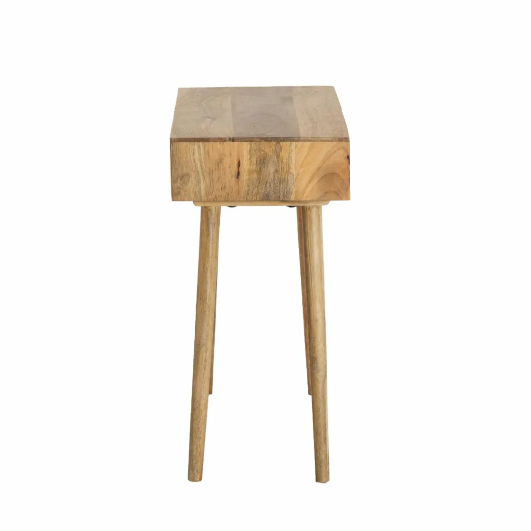 Épurée et légère visuellement, cette console en bois de manguier Maeva est un parfait mélange entre design rétro et praticité moderne. On adore son piétement haut et effilé, directement inspiré du style scandinave, qui lui donne une silhouette élancée pleine de charme.