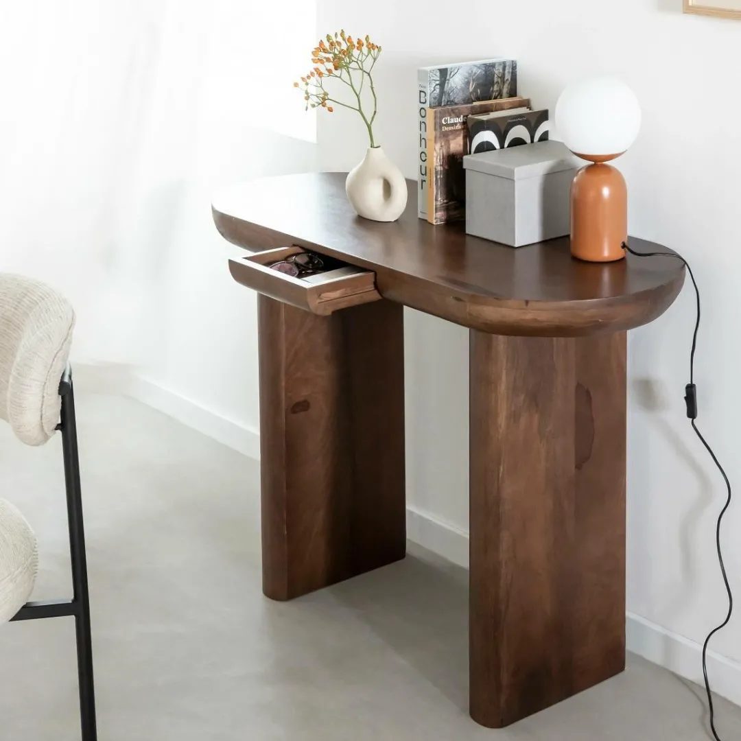 Cette console en bois de manguier foncé séduit par son design simple et raffiné. Son plateau aux lignes arrondies repose sur deux pieds massifs, lui offrant une allure robuste tout en conservant une élégance naturelle. La teinte foncée du bois met en valeur ses nuances chaleureuses et apporte une note sophistiquée à votre intérieur.