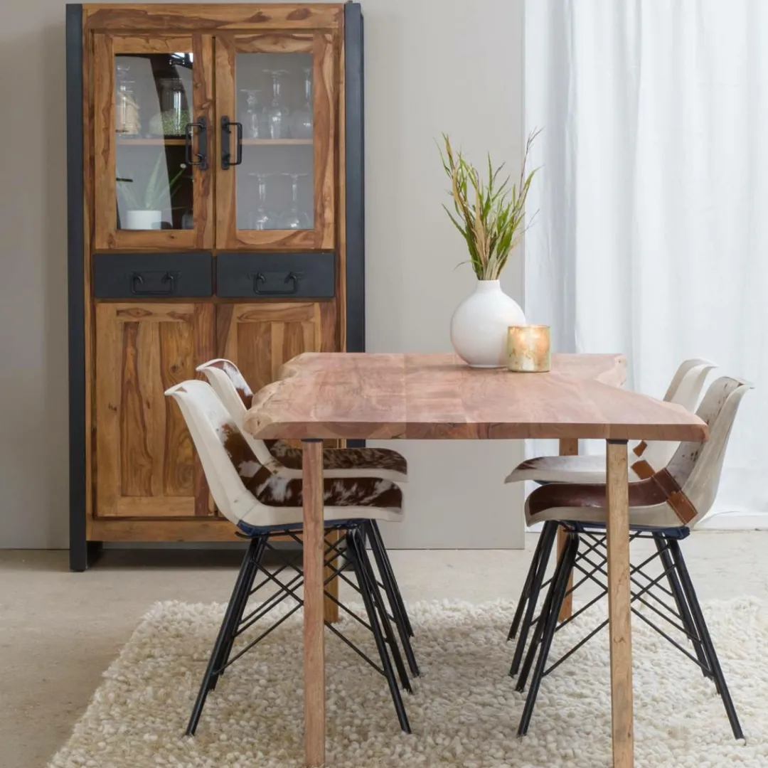 Voici le fameux vaisselier de la collection Havana. On le reconnait facilement grâce à ses nuances foncées toutes droits venus du bois d’acacia ainsi que sa structure rectangulaire entièrement dessinée en métal noir. Plus petit que la moyenne, ce buffet vaisselier peut être l’alternative parfaite pour toutes les personnes ayant un besoin précis ou qui souhaiteraient meubler un espace restreint.