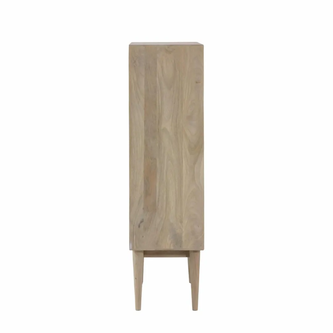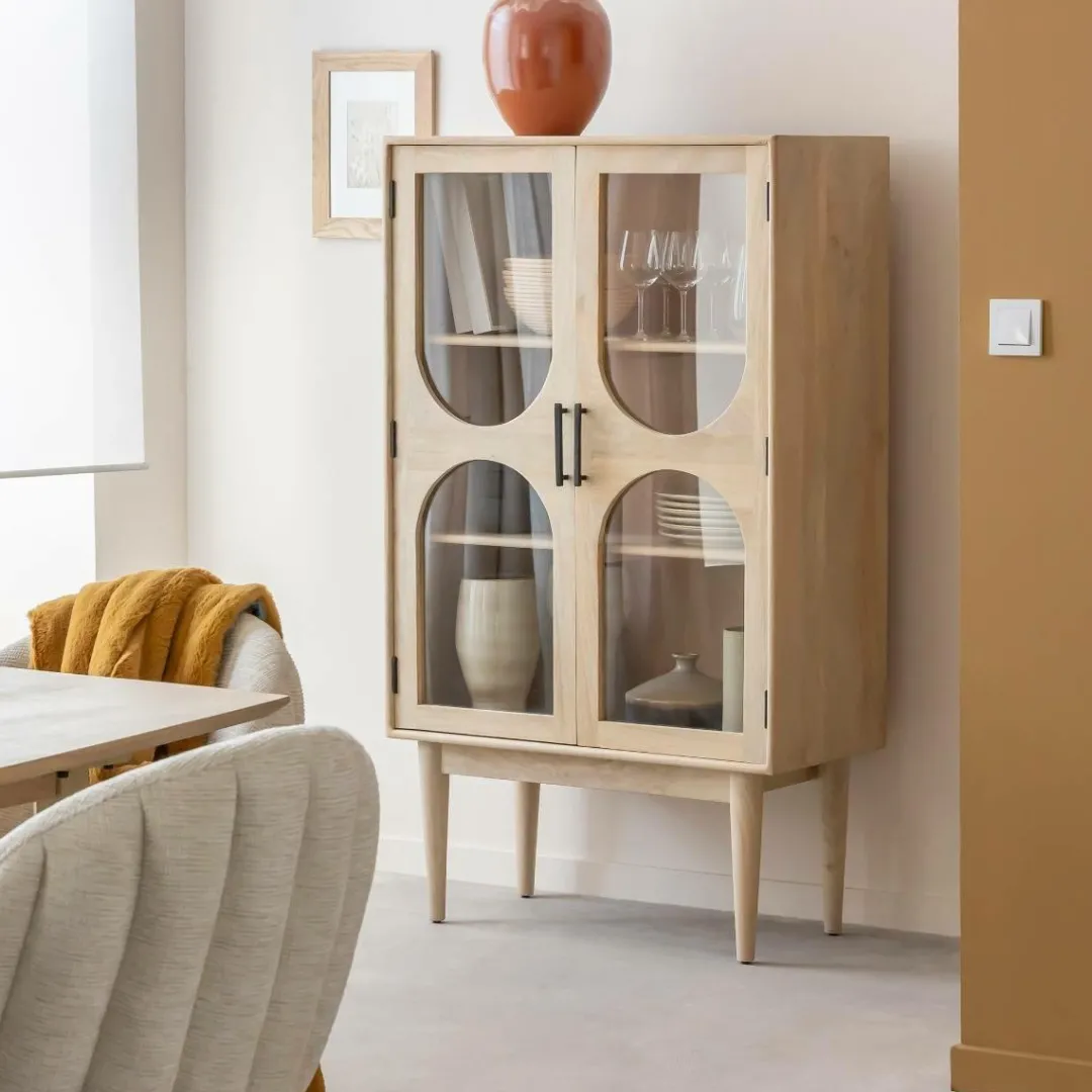 Cette vitrine Lydia séduit par son charme naturel et son design original. Conçue en bois de manguier massif, elle met en valeur la beauté et la chaleur de cette essence exotique, réputée pour sa solidité et ses nuances uniques. Ses portes vitrées aux découpes arrondies apportent une touche graphique et moderne qui fait toute son originalité.