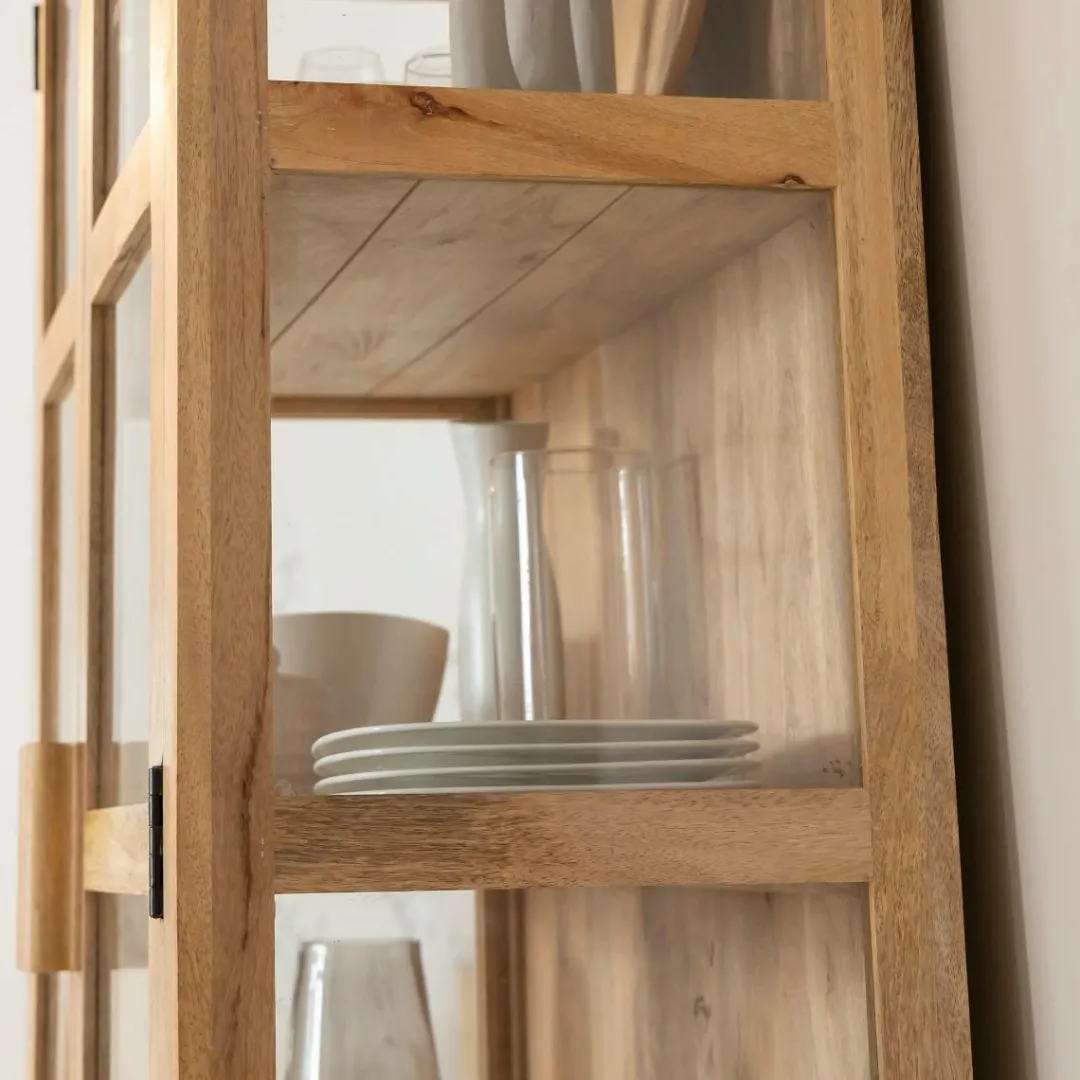 Fabriquée en bois de manguier massif et équipée de vitres, la vitrine Amaris dispose de deux portes battantes et de quatre étagères, idéales pour exposer vos objets de valeur, vos livres ou vos souvenirs de voyage. Chaque détail a été soigneusement pensé pour offrir une qualité et une durabilité exceptionnelles.