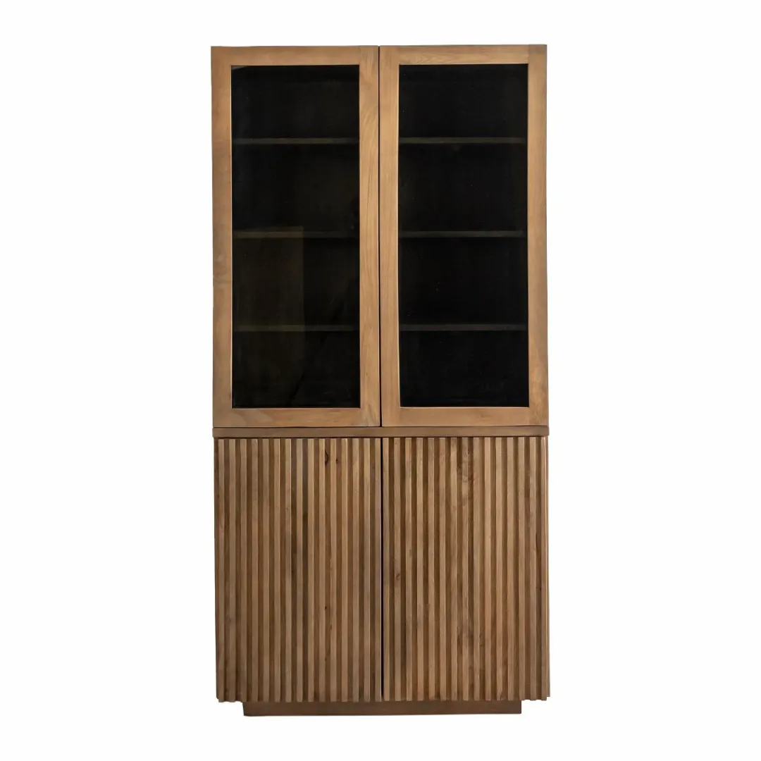 Affichez vos plus beaux objets avec élégance grâce à cette vitrine en bois de manguier de la collection Betty. Ce meuble deux-en-un se compose d’une base rainurée au design graphique et d’une partie haute vitrée à poser, pour un rendu aussi pratique qu’esthétique. Le contraste entre le fond noir et le bois clair met parfaitement en valeur ce que vous exposez, tandis que les portes vitrées en verre laissent subtilement deviner votre sélection.