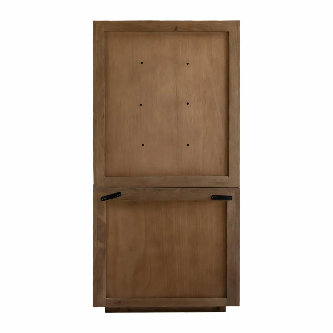 La vitrine offre un bel espace de rangement : quatre étagères permettent de disposer vaisselle, verres ou objets déco avec soin, tandis que la partie basse dissimule deux portes pour organiser ce que vous préférez garder hors de vue. Robuste et pleine de charme, cette vitrine s’intègre aussi bien dans une salle à manger que dans un salon ou un bureau.