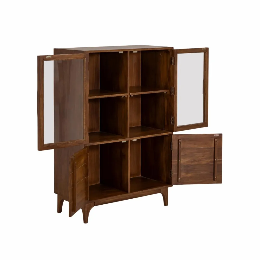 La partie haute est dotée de deux portes vitrées laissant entrevoir deux larges étagères, parfaites pour mettre en valeur votre vaisselle, vos livres ou vos objets décoratifs. La partie basse, composée de quatre tiroirs spacieux, permet un rangement optimisé, discret et ordonné. Les poignées intégrées directement dans la façade en bois assurent un rendu épuré, sans surcharger le meuble.